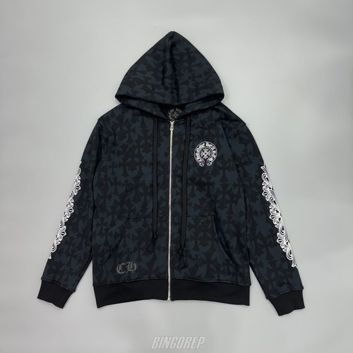 시그니처 크로스 패턴에 플로랄 프린트 소매, 그리고 전면 CH 자수까지 크롬하츠 디테일이 집약된 후드 집업.